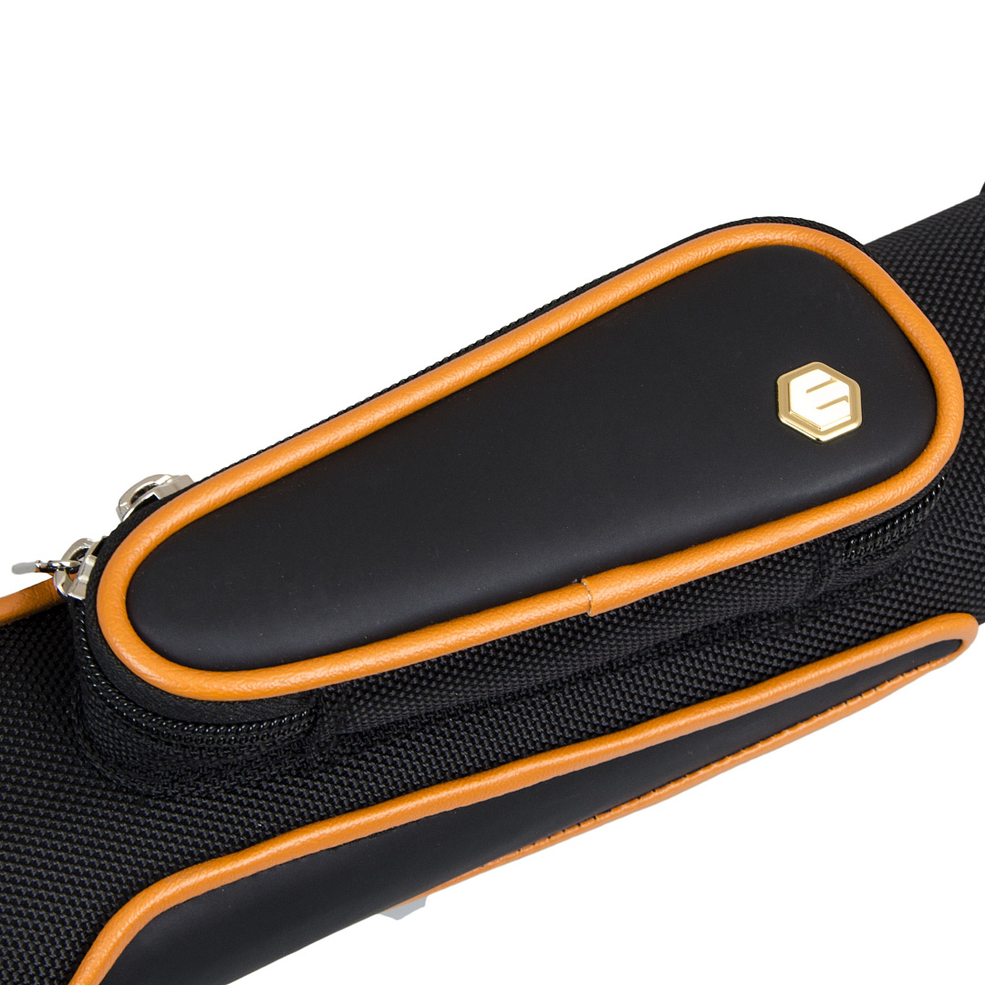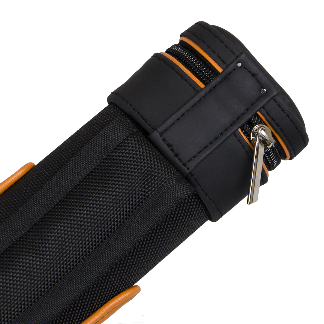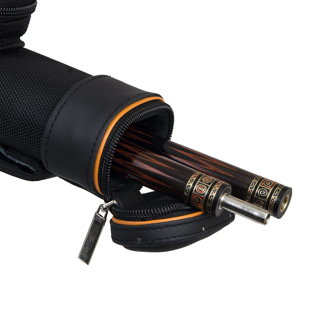 Есть ручка сбоку и наплечный ремень с регулировкой длины. На ремне есть специальная вставка для комфортной носки на плече. Каждая часть кия хранится в отдельном отсеке. С внешней стороны имеются карманы для аксессуаров и удлинителя. Большой карман внутри снабжен дополнительной молнией для надежной фиксации.