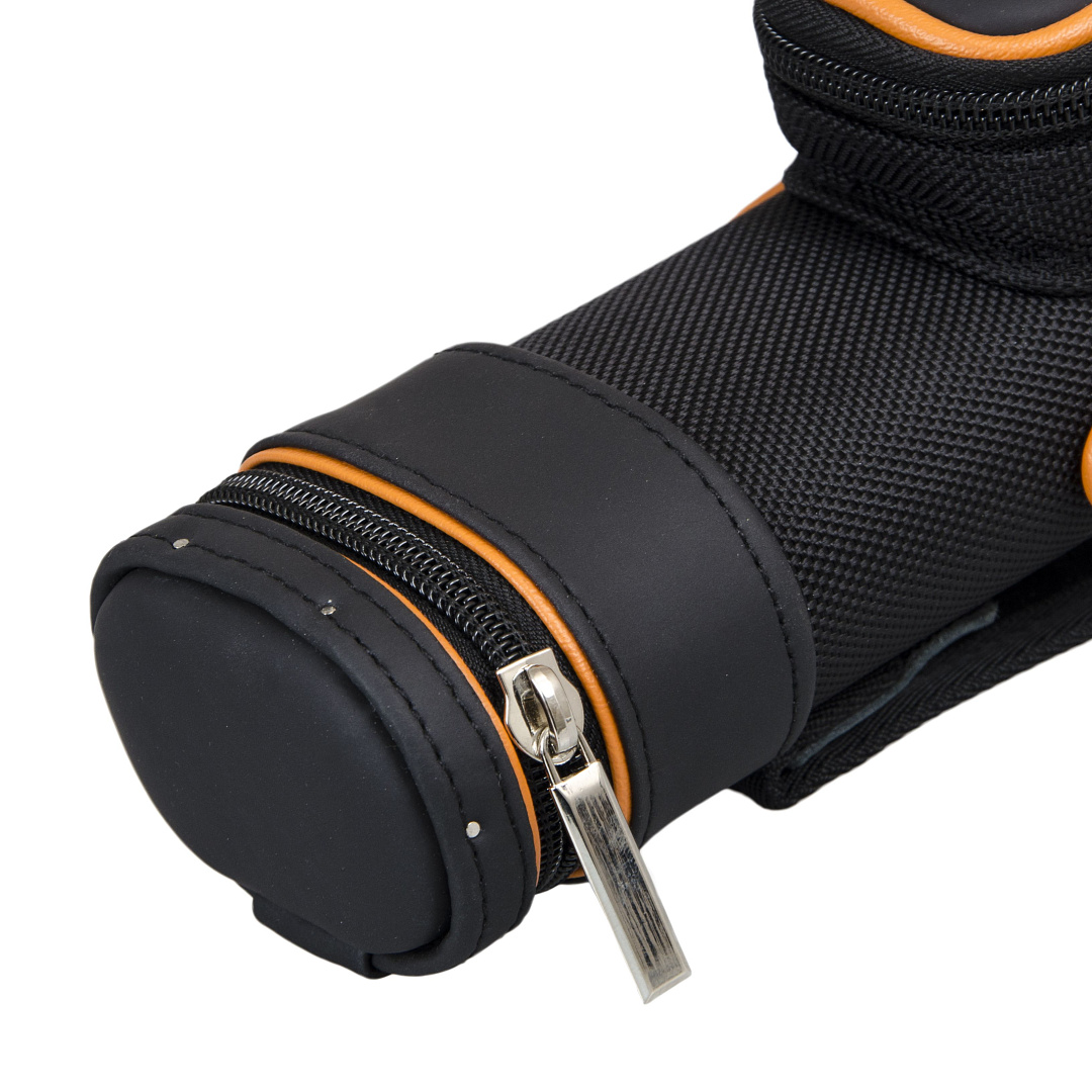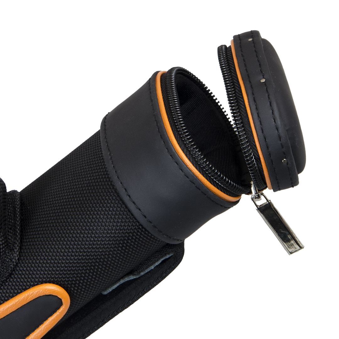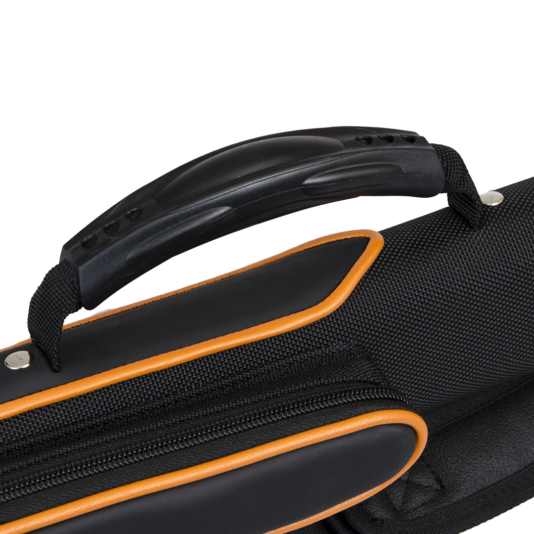 Есть ручка сбоку и наплечный ремень с регулировкой длины. На ремне есть специальная вставка для комфортной носки на плече. Каждая часть кия хранится в отдельном отсеке. С внешней стороны имеются карманы для аксессуаров и удлинителя. Большой карман внутри снабжен дополнительной молнией для надежной фиксации.