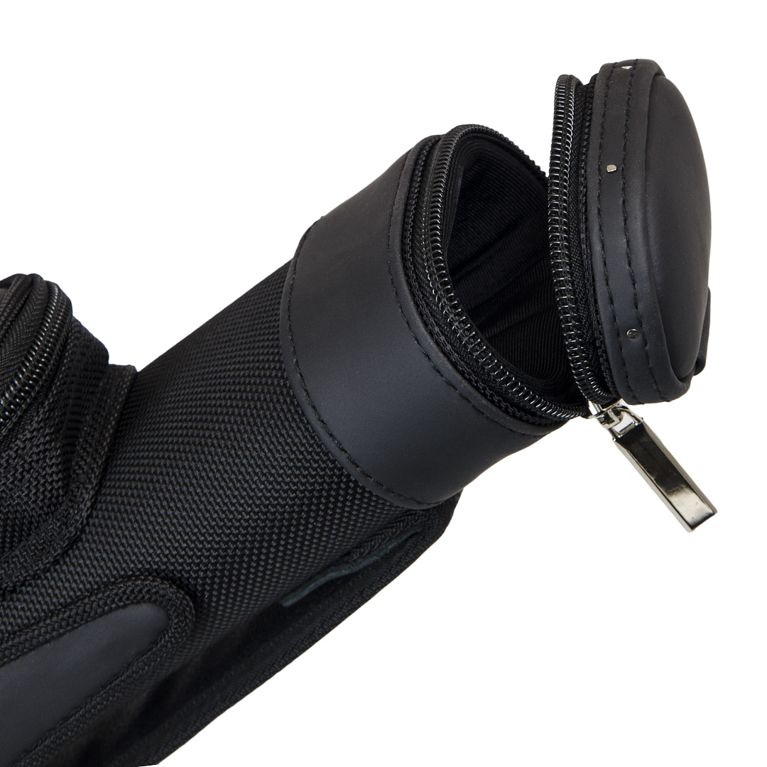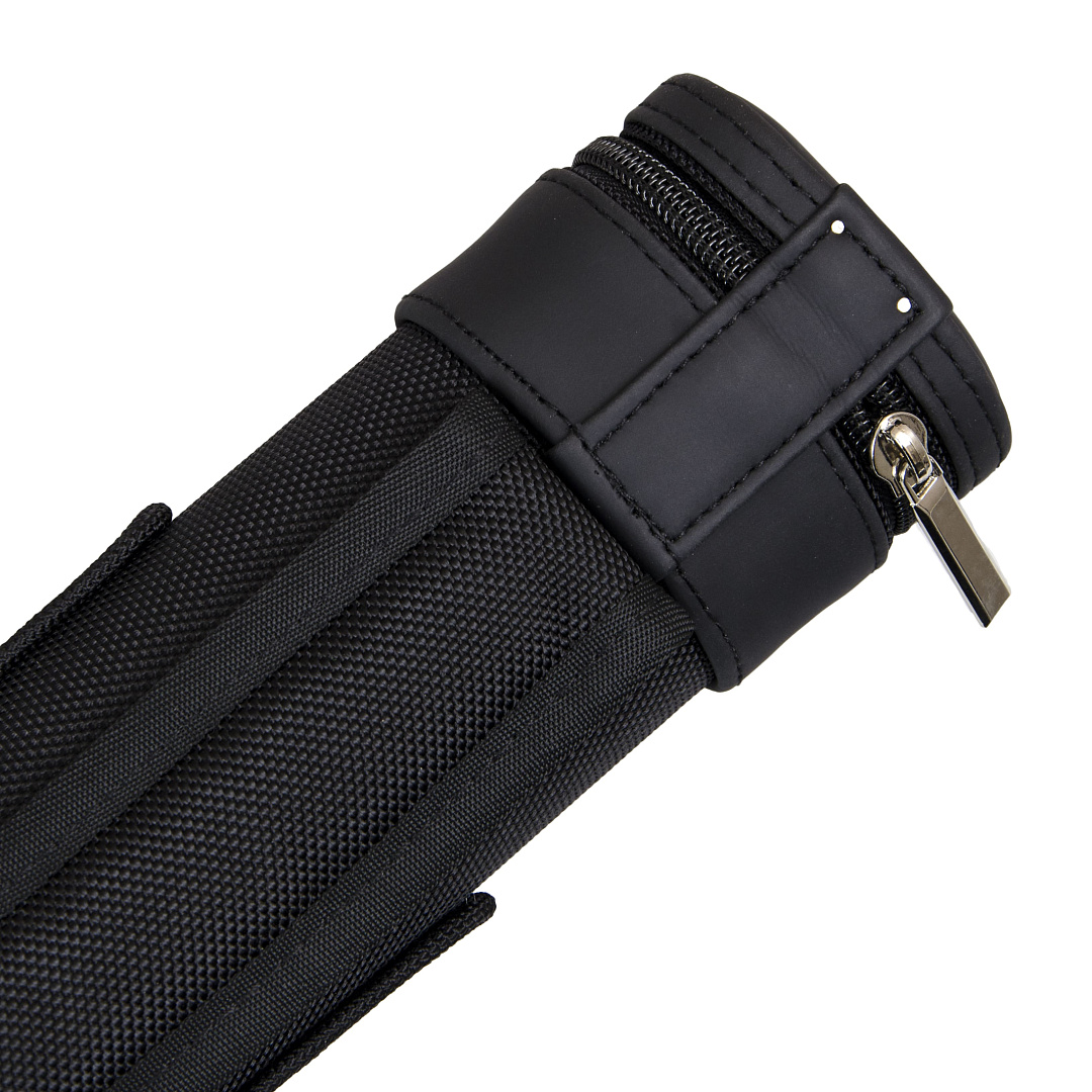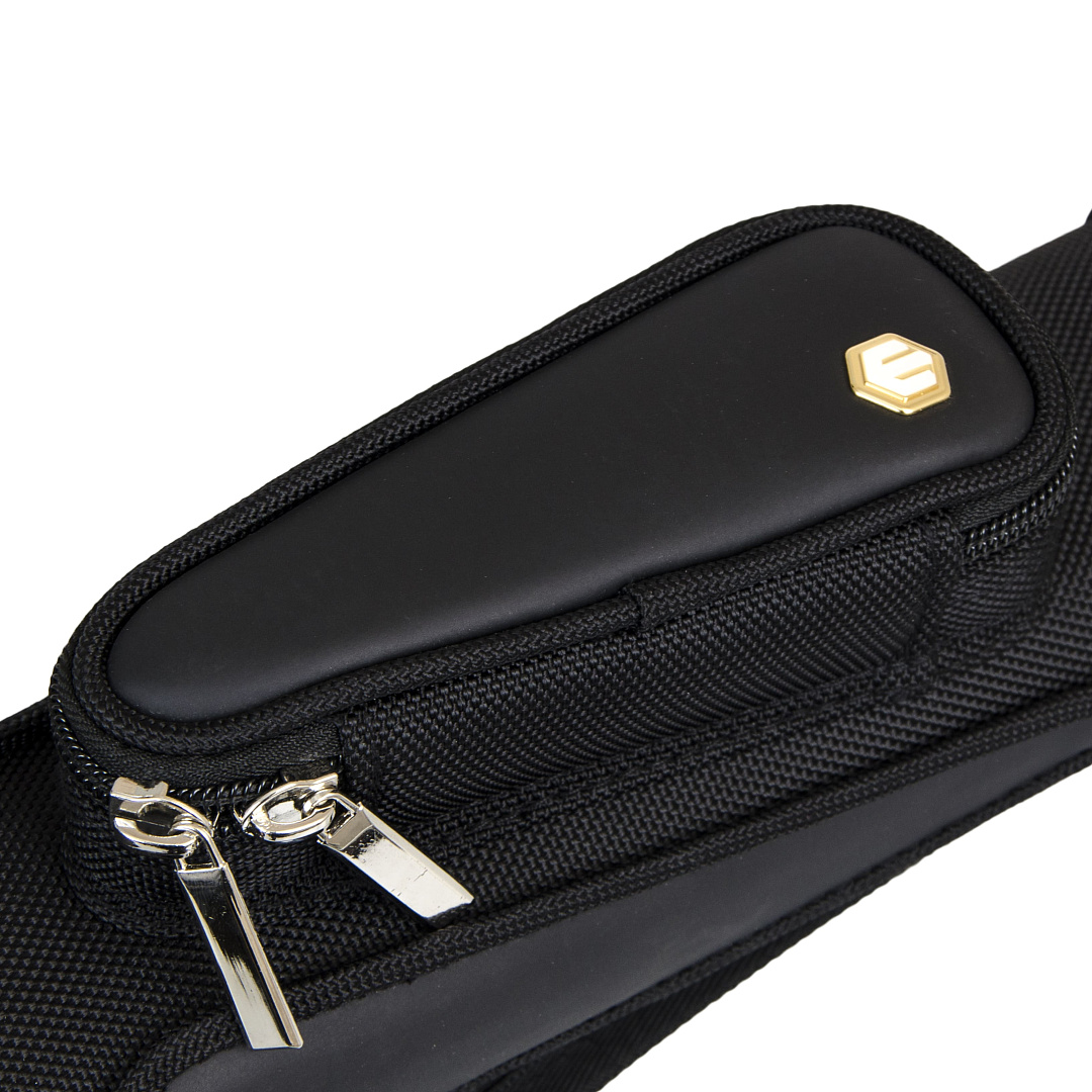 Есть ручка сбоку и наплечный ремень с регулировкой длины. На ремне есть специальная вставка для комфортной носки на плече. Каждая часть кия хранится в отдельном отсеке. С внешней стороны имеются карманы для аксессуаров и удлинителя. Большой карман внутри снабжен дополнительной молнией для надежной фиксации.