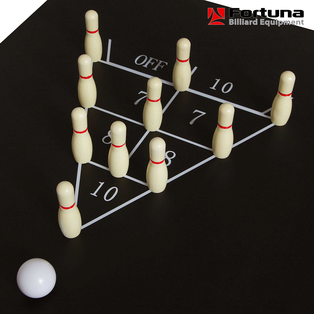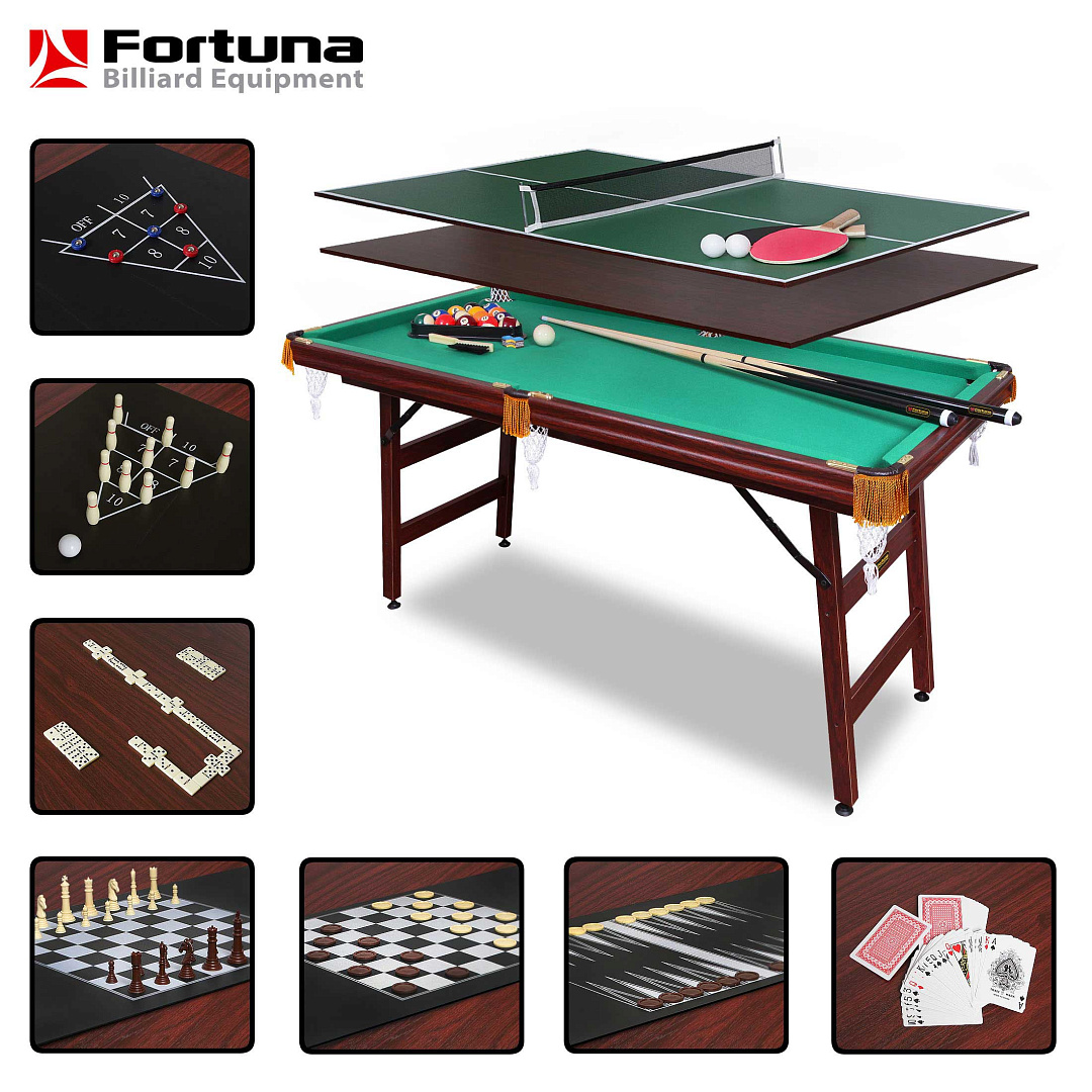 Бильярдный стол Fortuna Пул 5 футов 9 в 1 - это многофункциональный игровой стол, включающий 9 игр: американский бильярд, шашки, шахматы, нарды, настольный теннис (пинг-понг), кегли, шаффлборд, игральные карты и домино.