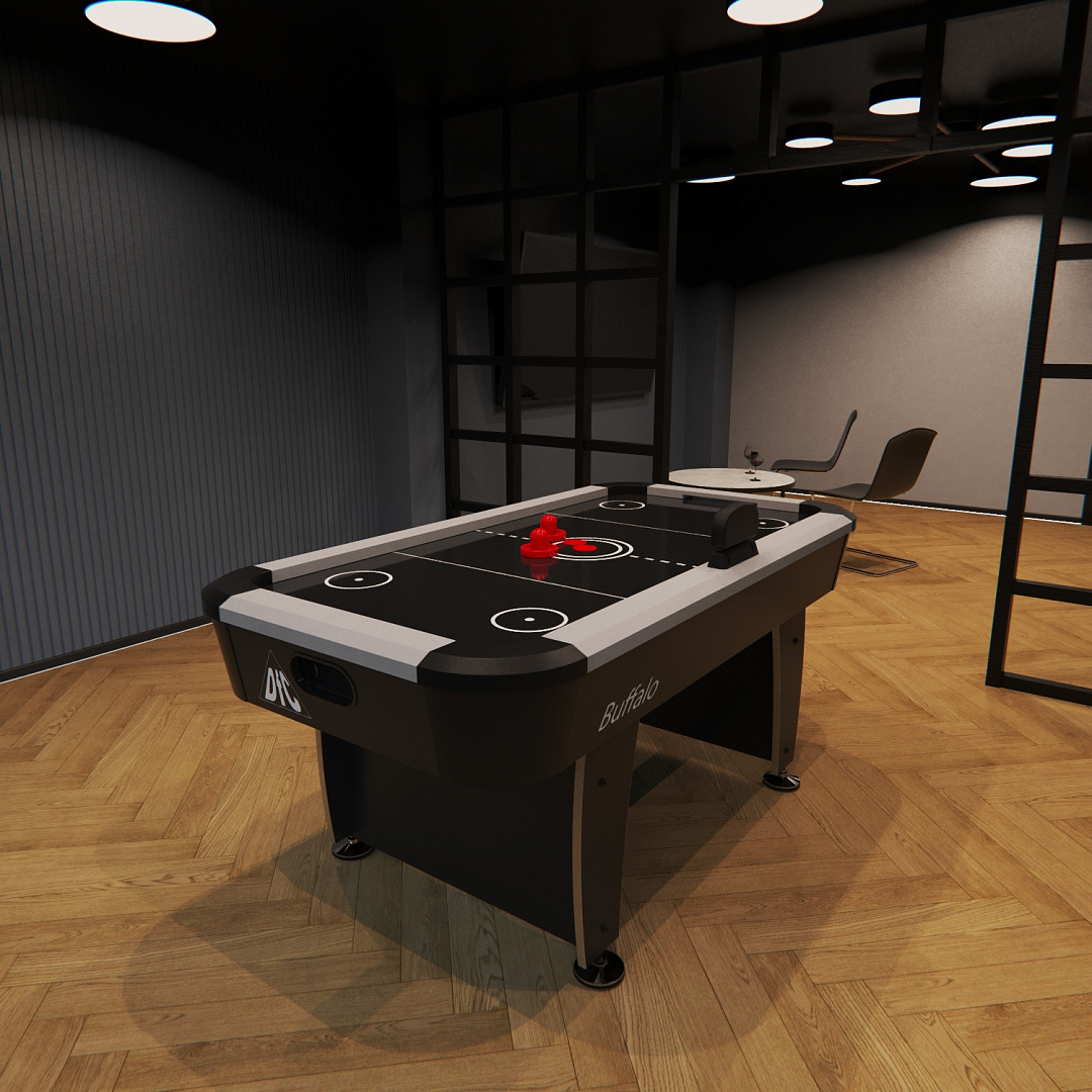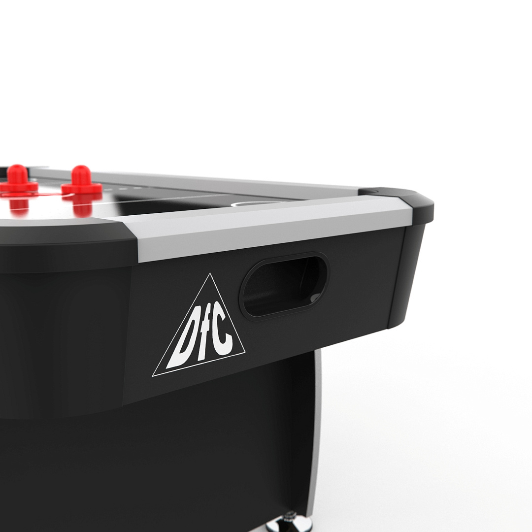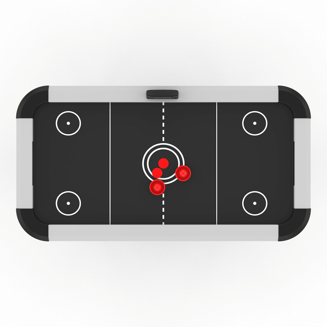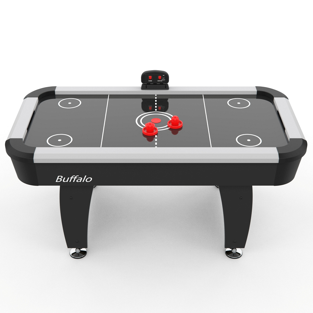 Стол оборудован электронным табло для подсчета очков. Корпус выполнен из специально обработанного МДФ, сверху покрытого прочной пленкой из ПВХ. Мощный компрессор подает воздух через отверстия. Напряжение: 220В.