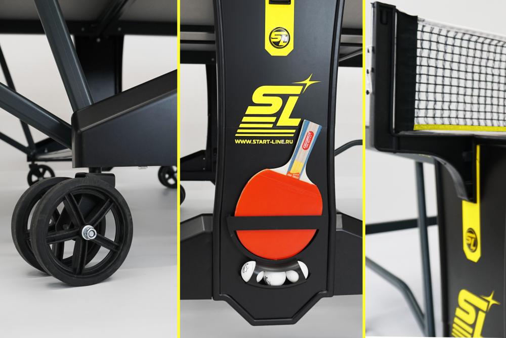 Комфортная система складывания стола является собственной разработкой Start Line. Она предусматривает усовершенствованный механизм, позволяющий быстро и надежно закрепить положение стола как в разложенном, так и в сложенном виде. Все манипуляции производятся с рабочего места игрока для каждой из столешниц. С такой системой складывания легко справляется один человек, а стол при хранении занимает минимум пространства. Конструкция предусматривает дополнительную фиксацию в сложенном виде безопасной транспортировки стола, а также возможность одиночной игры.