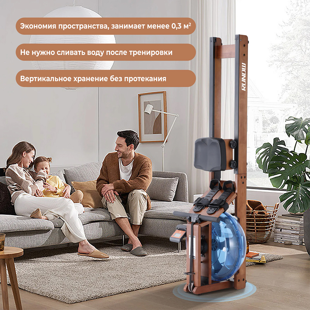 Гребной тренажер DFC Runow 6205 выполнен в цвете Грецкий орех и предназначен для пользователей весом до 125 килограмм. Тренажер компактен и может быть установлен вертикально у стены.