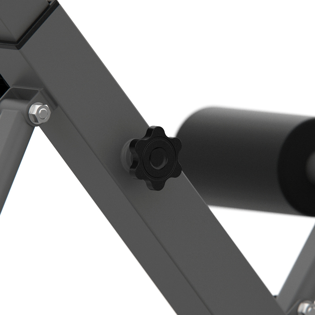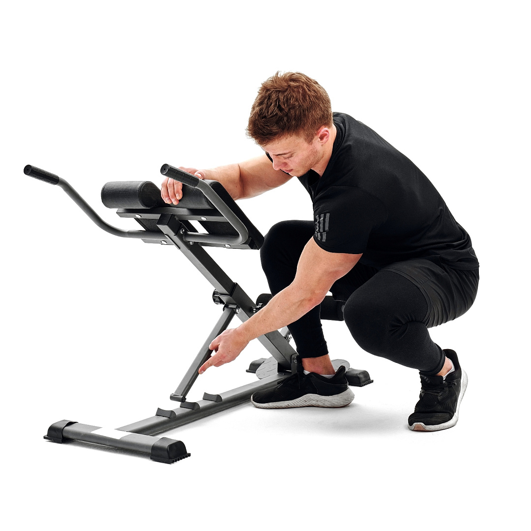 Гиперэкстензия легко регулируется без дополнительных инструментов. Доступны три уровня наклона рабочей поверхности, что расширяет возможности использования тренажера: 28, 32 и 45°. По высоте подушки регулируются на 7 уровней.