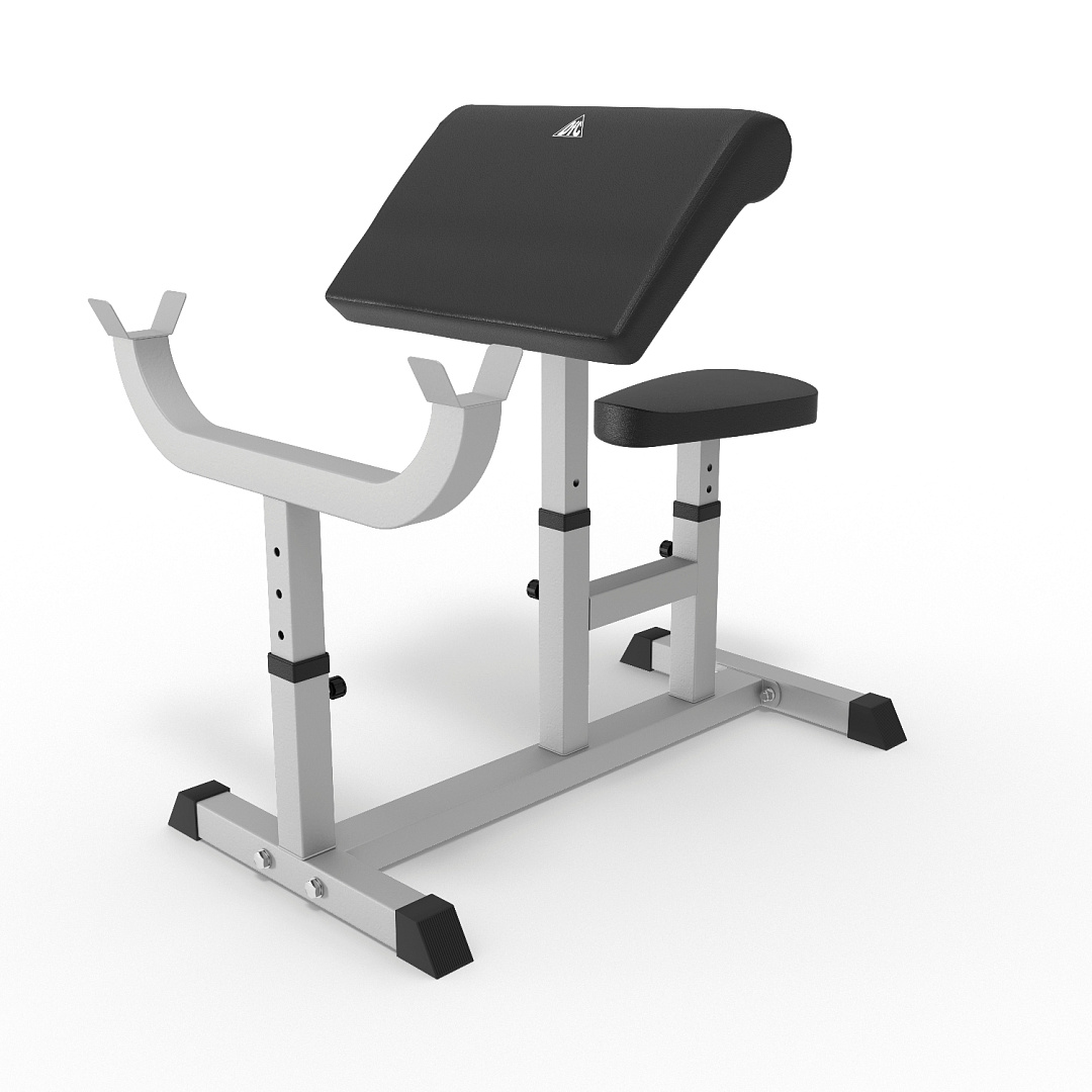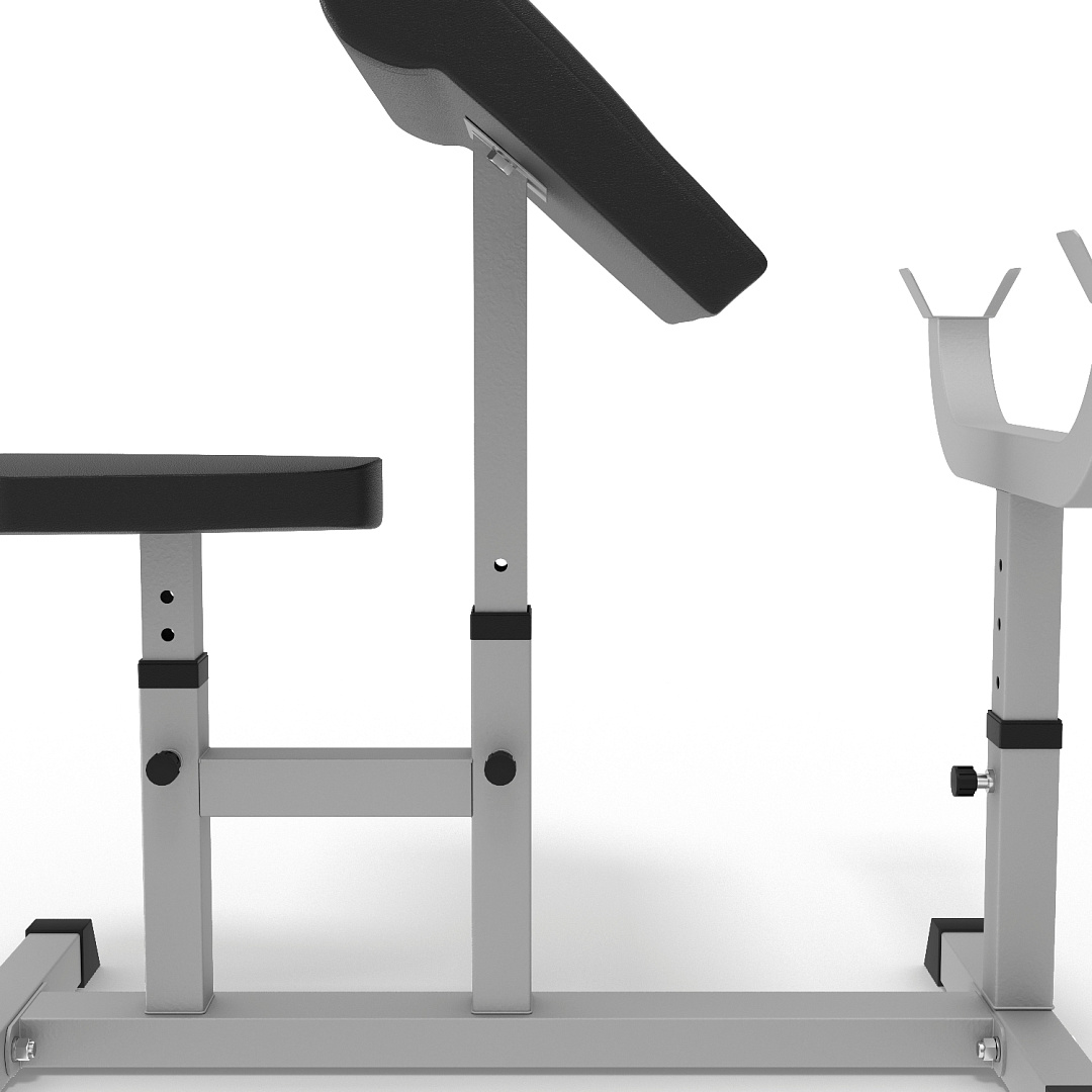 Сиденье, парта для бицепса и стойки под штангу регулируются по высоте.